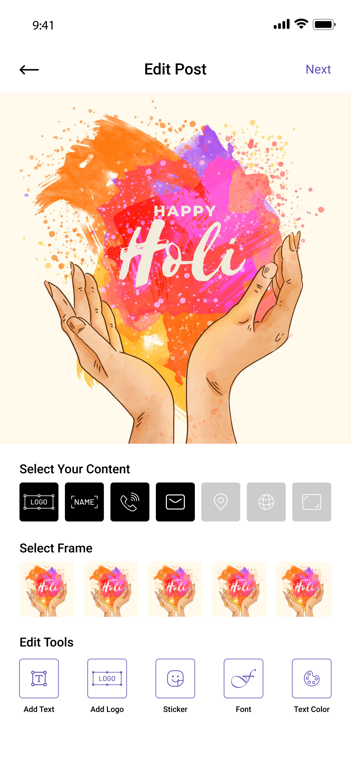 Add your own Photo from Phone Gallery and Set in the Readymade Frame Layout with Company Details like Business Logo, Name, Mobile Number, Gmail ID, Website & Address.